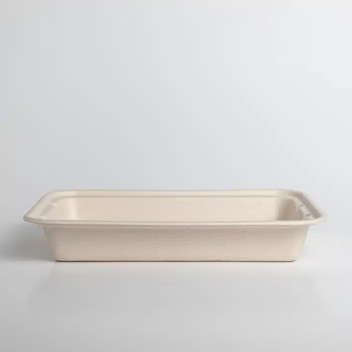 Bandeja Rectangular 32oz. Hecho a base de bagazo de trigo. Material biodegradable y compostable. Soporta microondas y congelador. No escurre ni absorbe. Su degradación se da entre los 90 y los 180 días en composta industrial.