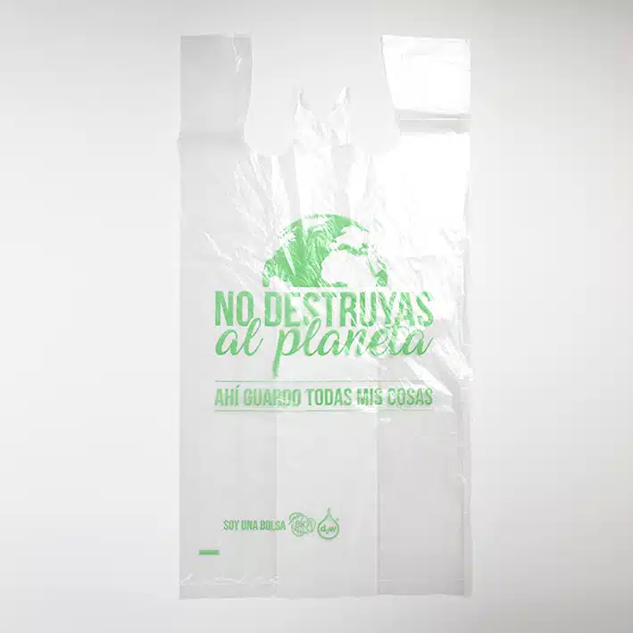 Bolsa camiseta oxo-biodegradable grande (30cm largo, 16cm fuelle, 60cm altura). Fabricado con aditamento d2w, con el fin de acelerar su proceso de degradación. Alta resistencia al peso. Resiste humedad y calor. Calibre 150.