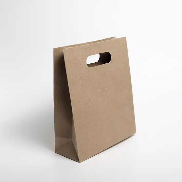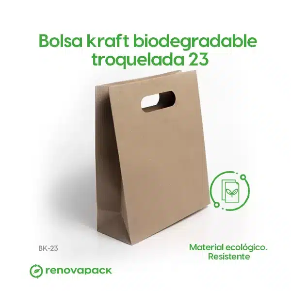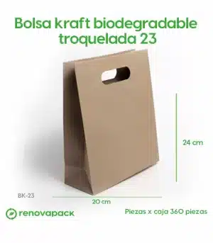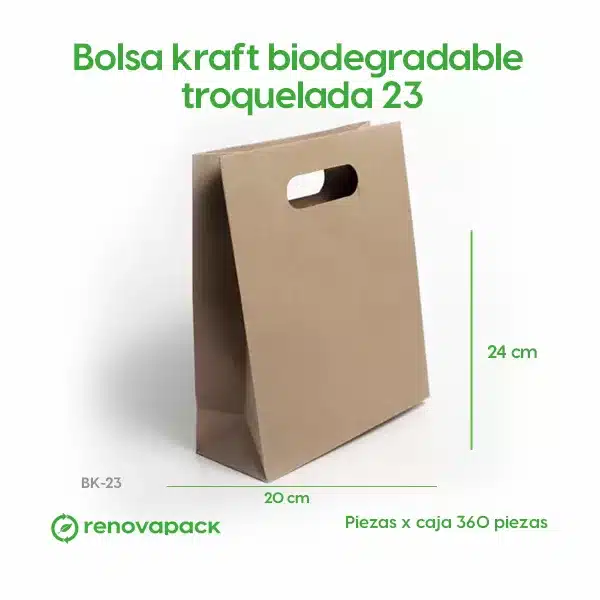Bolsa Kraft Biodegradable Troquelada 23 (20 cm de ancho, 8 cm de fuelle, 24 cm de altura) Bolsa ecológica, no contiene cera ni revestimiento de plástico, fabricado a base de papel.