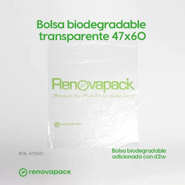Bolsa oxo-biodegradable transparente 47×60. Fabricado con aditamento d2w, con el fin de acelerar su proceso de degradación. Alta resistencia al peso. Resiste humedad y calor. Calibre 180.