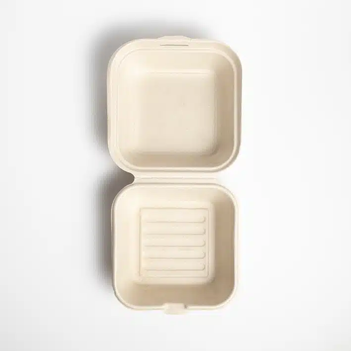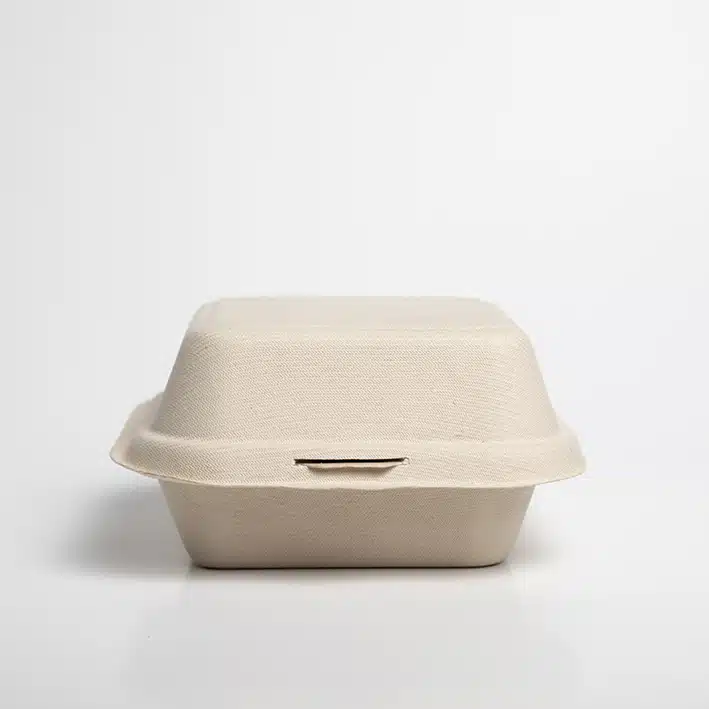 Contenedor hamburguesero biodegradable 6x6x3. Hecho a base de bagazo de trigo. Material biodegradable y compostable. Soporta microondas y congelador. No escurre ni absorbe. Su degradación se da entre los 90 y los 180 días en composta industrial.