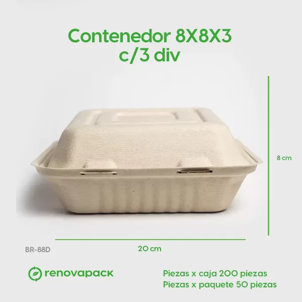 Contenedor Biodegradable 8x8x3 c/3div