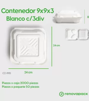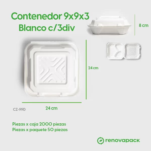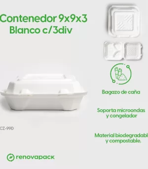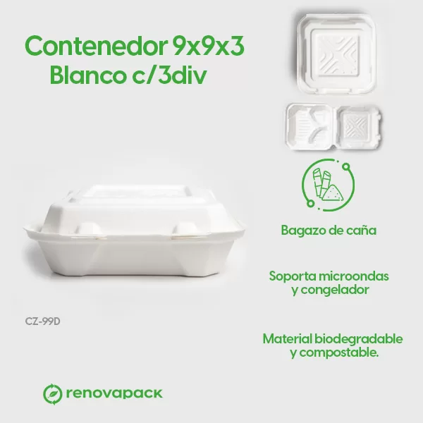 Contenedor 9x9x3 Blanco c/3div. Hecho a base de bagazo de caña. Material biodegradable y compostable. Soporta microondas y congelador. No escurre ni absorbe. Su degradación se da entre los 90 y los 180 días en composta industrial.