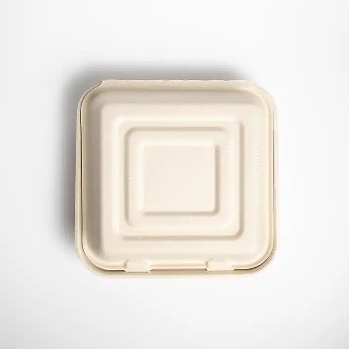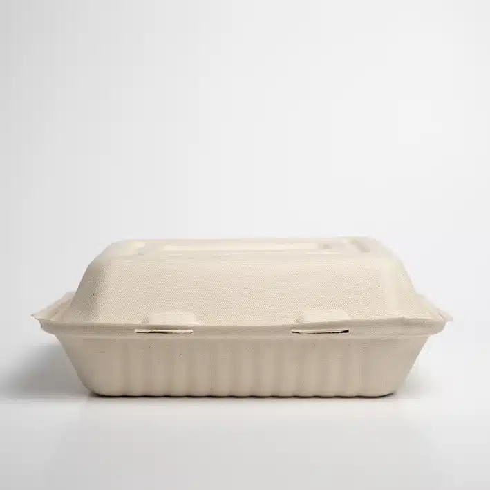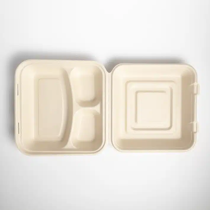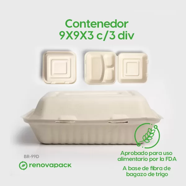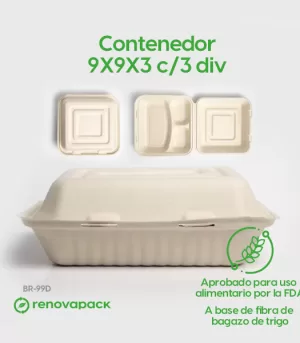 Contenedor Biodegradable 9x9x3 c/3div. Hecho a base de bagazo de trigo. Material biodegradable y compostable. Soporta microondas y congelador. No escurre ni absorbe. Su degradación se da entre los 90 y los 180 días en composta industrial.