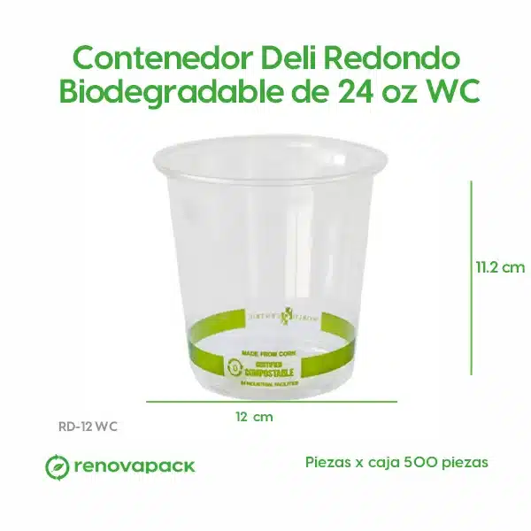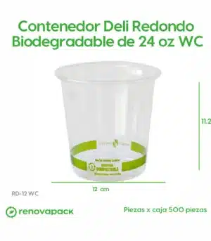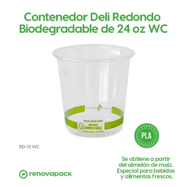 Deli Redondo 24 oz Biodegradable. Hecho a base de polímero PLA. Material biodegradable y compostable. Especial para alimentos y bebidas frías. Soporta hasta 40ºC. Su degradación se da entre los 90 y los 180 días en composta industrial.
