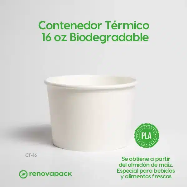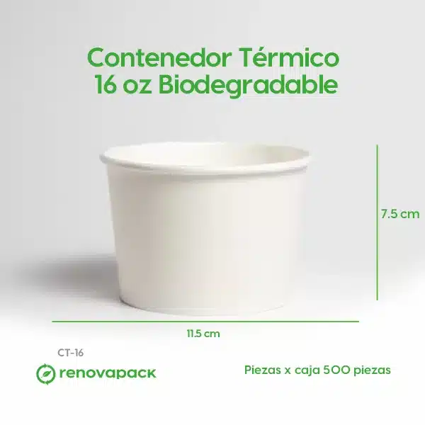Contenedor Térmico 16oz Biodegradable. (11.5cm de diámetro, 7.5cm de altura). Hecho de papel y laminado de PLA. Materiales biodegradables y compostables. Especial para alimentos y bebidas calientes. Material térmico. Su degradación se da entre los 90 y los 180 días en composta industrial.