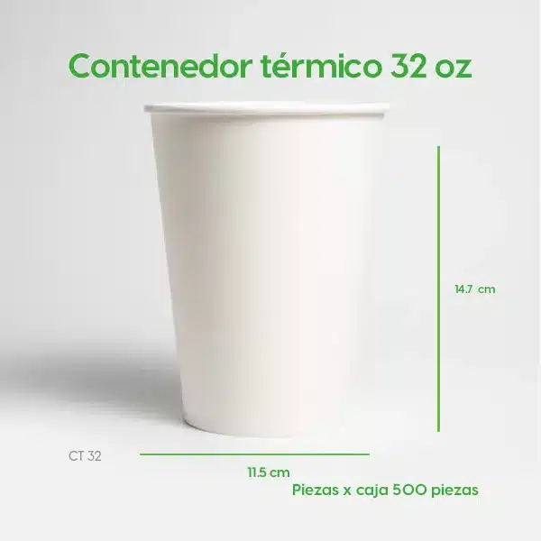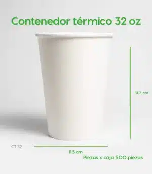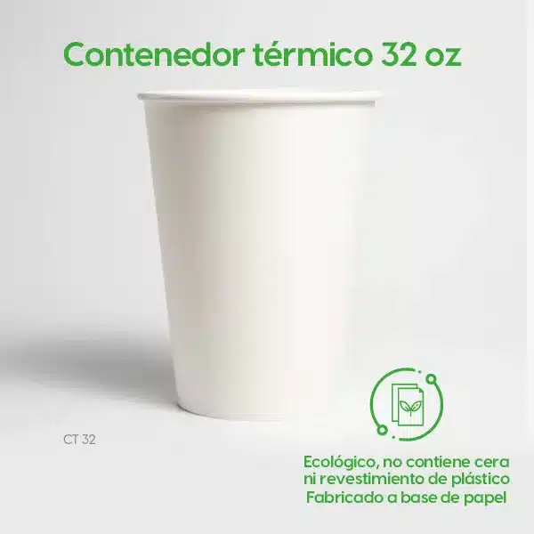 Contenedor Térmico 32oz Biodegradable. (11.5cm de diámetro, 14.7cm de altura) Hecho de papel y laminado de PLA. Materiales biodegradables y compostables. Especial para alimentos y bebidas calientes. Material térmico. Su degradación se da entre los 90 y los 180 días en composta industrial.