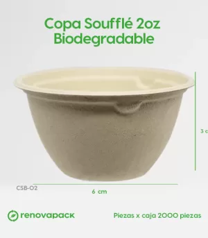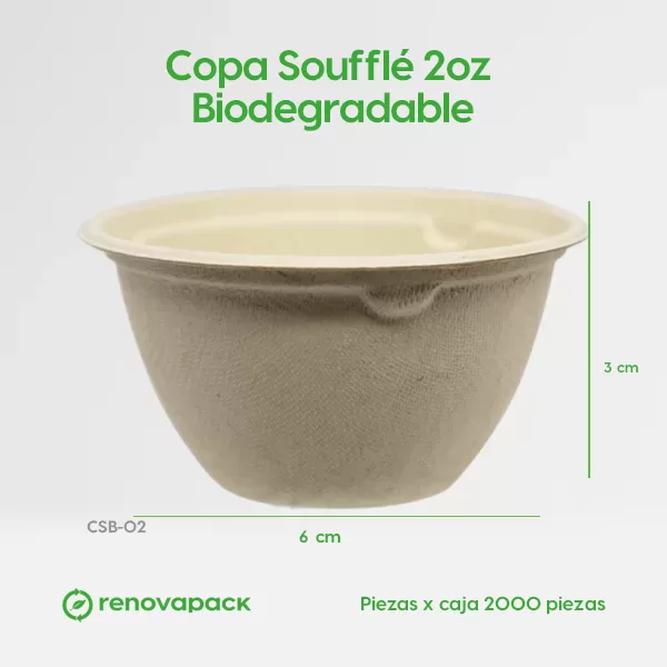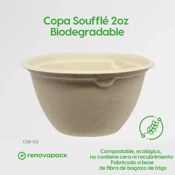 Copa soufflé 2 oz biodegradable. Hecho a base de bagazo de trigo. Material biodegradable y compostable. Soporta microondas y congelador. No escurre ni absorbe. Su degradación se da entre los 90 y los 180 días en composta industrial.