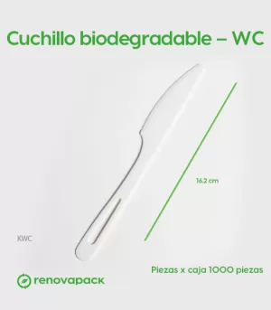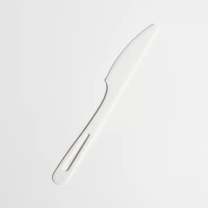 Cuchillo biodegradable de 16 cm, hecha de PLA, material compostable que se obtiene del almidón de maíz. Resiste hasta 40 grados. Ideal para alimentos y bebidas fresscas. No soporta microondas