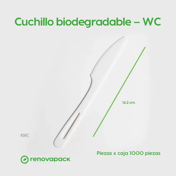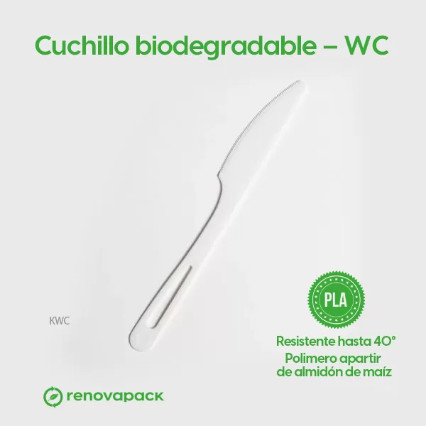 Cuchillo biodegradable WC, 16.2 cm de largo, hecho de PLA, polímero constituido por moléculas de ácido láctico, es un termoplástico que se obtiene a partir de almidón de maíz.