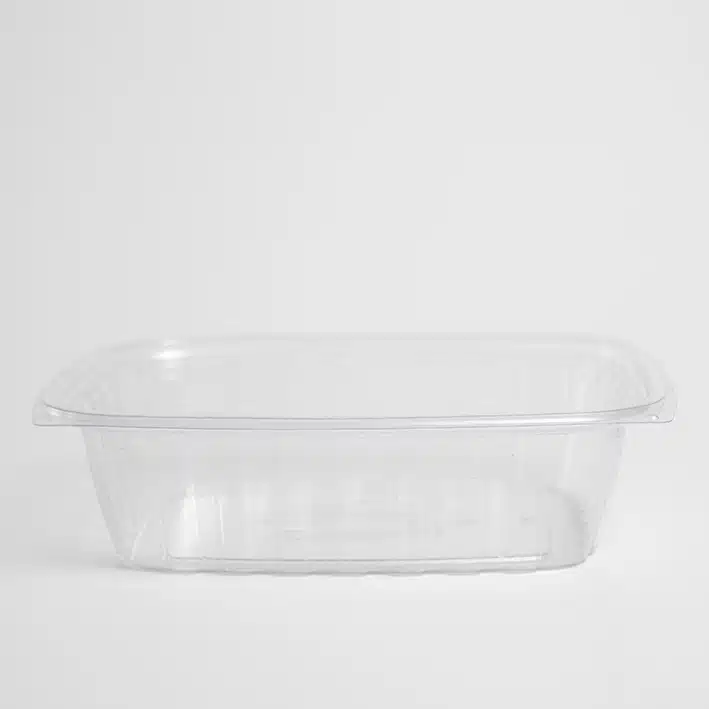 Deli Rectangular 24oz Biodegradable (20cm largo, 16.6cm ancho y 5.5cm altura). Hecho a base de polímero PLA. Material biodegradable y compostable. Especial para alimentos y bebidas frías. Soporta hasta 40ºC. Su degradación se da entre los 90 y los 180 días en composta industrial.