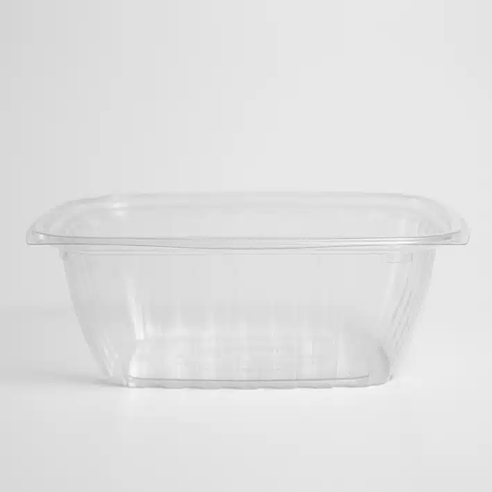 Deli Rectangular 32oz Biodegradable (19.3cm largo, 16.3cm ancho y 7.5cm altura). Hecho a base de polímero PLA. Material biodegradable y compostable. Especial para alimentos y bebidas frías. Soporta hasta 40ºC. Su degradación se da entre los 90 y los 180 días en composta industrial.