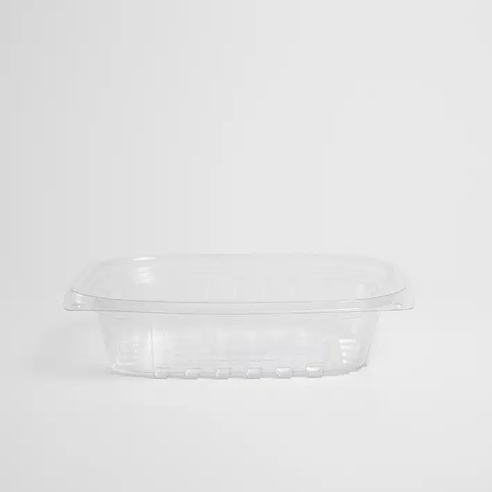 Deli Rectangular 8oz Biodegradable (15cm largo, 12cm ancho y 3.5cm altura). Hecho a base de polímero PLA. Material biodegradable y compostable. Especial para alimentos y bebidas frías. Soporta hasta 40ºC. Su degradación se da entre los 90 y los 180 días en composta industrial.