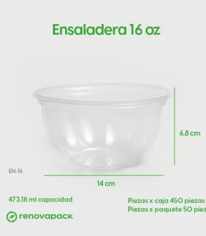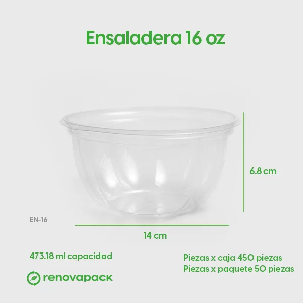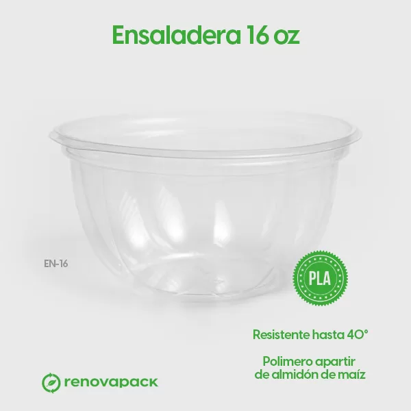 Ensaladera Biodegradable 16oz, (13cm diámetro, 6.8cm altura y 473.18ml capacidad). Hecho a base de polímero PLA. Material biodegradable y compostable. Especial para alimentos y bebidas frías. Soporta hasta 40ºC. Su degradación se da entre los 90 y los 180 días en composta industrial.