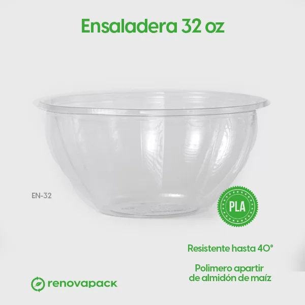 Ensaladera Biodegradable 32oz, (17.2cm diámetro, 12cm altura y 946.35ml capacidad). Hecho a base de polímero PLA. Material biodegradable y compostable. Especial para alimentos y bebidas frías. Soporta hasta 40ºC. Su degradación se da entre los 90 y los 180 días en composta industrial.