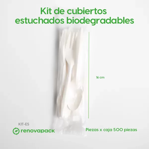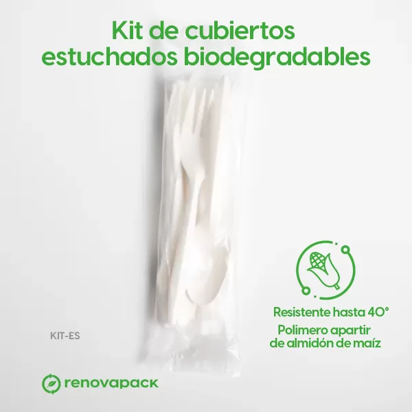 Kit de Cubiertos Estuchados Biodegradables hechos a base de fécula de maíz. Empacados en bolsa de fécula de maíz compostable. Cubiertos resistentes y flexibles, especiales para comidas frías y calientes.
