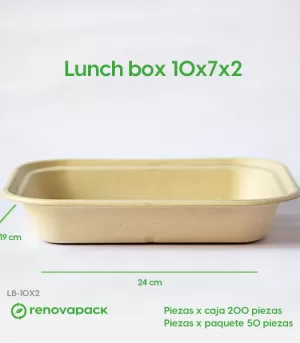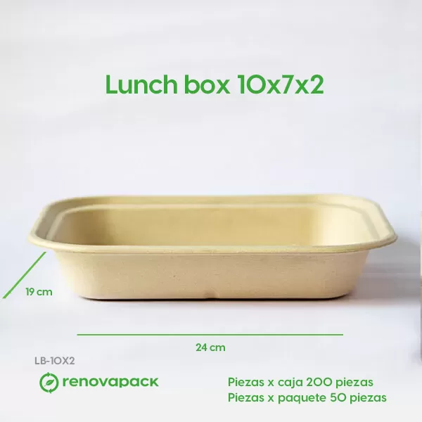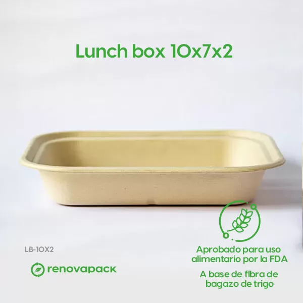 Contenedor Biodegradable Lunch-box 10×2. Hecho a base de bagazo de trigo. Material biodegradable y compostable. Soporta microondas y congelador. No escurre ni absorbe. Su degradación se da entre los 90 y los 180 días en composta industrial.