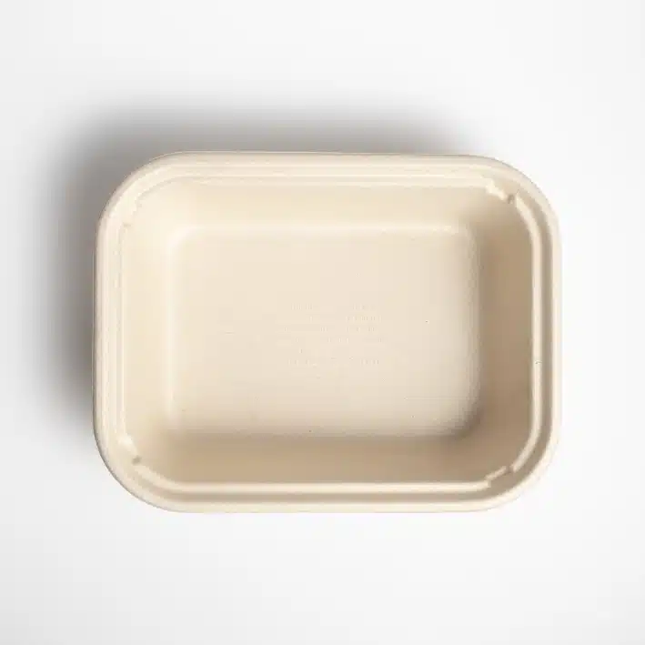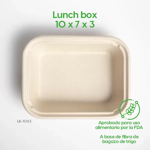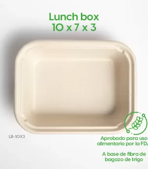 Contenedor Biodegradable Lunch-box 10×3. Hecho a base de bagazo de trigo. Material biodegradable y compostable. Soporta microondas y congelador. No escurre ni absorbe. Su degradación se da entre los 90 y los 180 días en composta industrial.