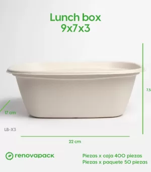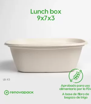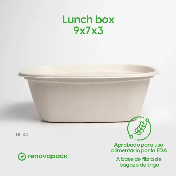 Contenedor Biodegradable Lunch-box 9x7x3. Hecho a base de bagazo de trigo. Material biodegradable y compostable. Soporta microondas y congelador. No escurre ni absorbe. Su degradación se da entre los 90 y los 180 días en composta industrial.
