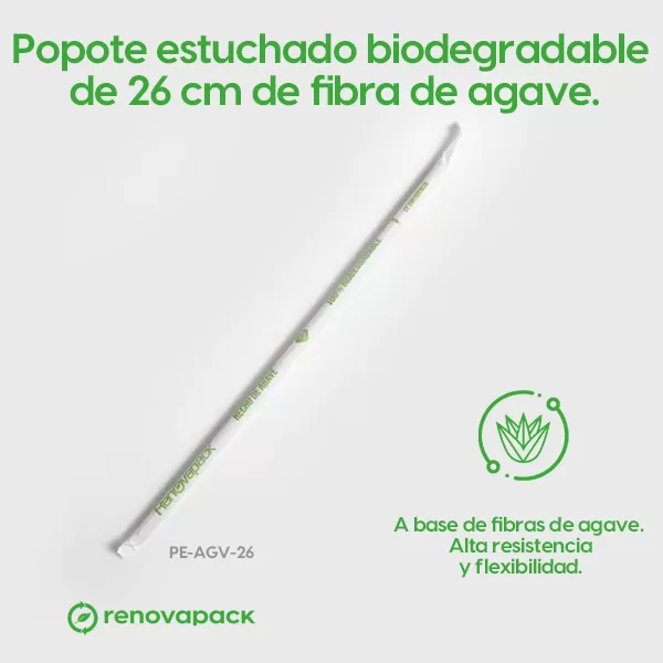 Popote biodegradable estuchado de 26 cm. Hecho de fibra de agave, 100% biodegradable. Estuchado de papel. Resistente y especial para bebidas frías y calientes.