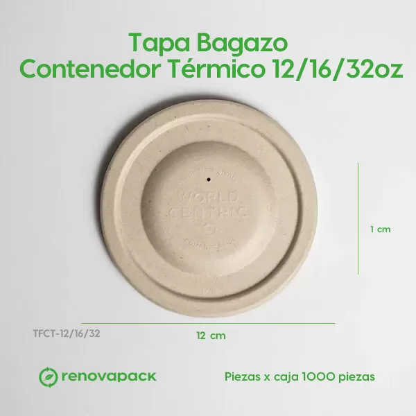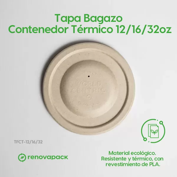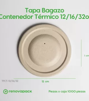 Tapa Bagazo Contenedor Térmico de 12, 16 y 32 oz. Hecho a base de bagazo de trigo. Material biodegradable y compostable. Soporta microondas y congelador. No escurre ni absorbe. Su degradación se da entre los 90 y los 180 días en composta industrial.