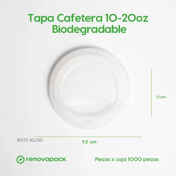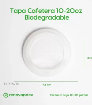 Tapa Cafetera 10-20oz Biodegradable. (9.2cm de diámetro, 1.1cm de altura). Hecho a base de polímero PLA. Material biodegradable y compostable. Especial para alimentos y bebidas frías. Soporta hasta 40ºC. Su degradación se da entre los 90 y los 180 días en composta industrial.