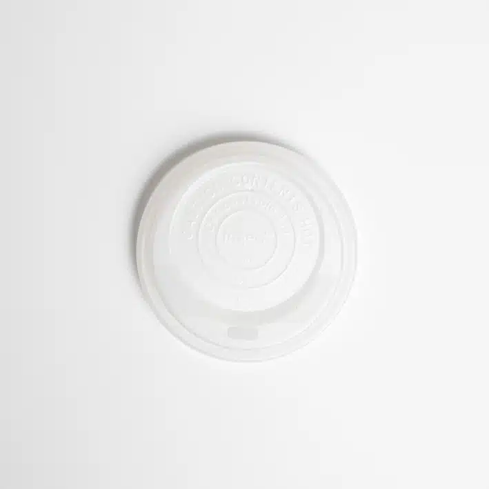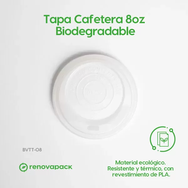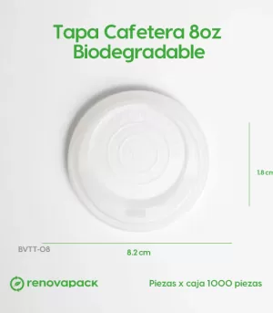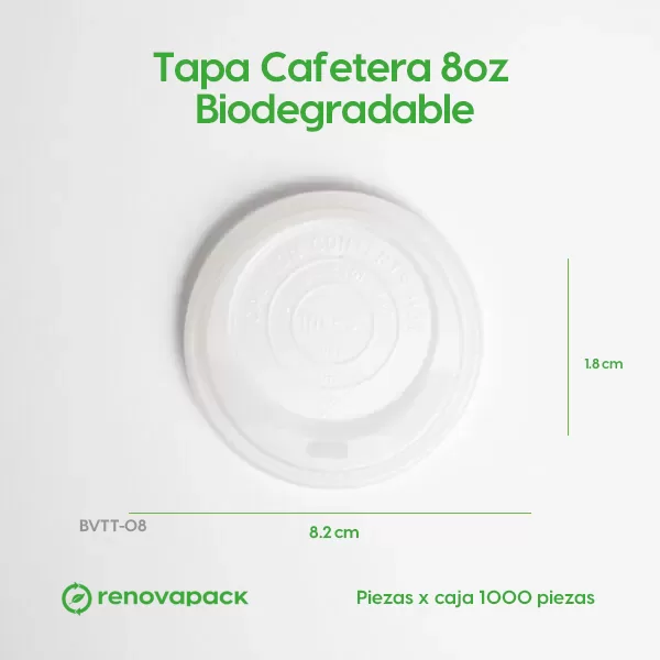 Tapa Cafetera 8oz Biodegradable (8.2cm de diámetro, 1.8cm de altura). Hecho a base de polímero PLA. Material biodegradable y compostable. Especial para alimentos y bebidas frías. Soporta hasta 40ºC. Su degradación se da entre los 90 y los 180 días en composta industrial.