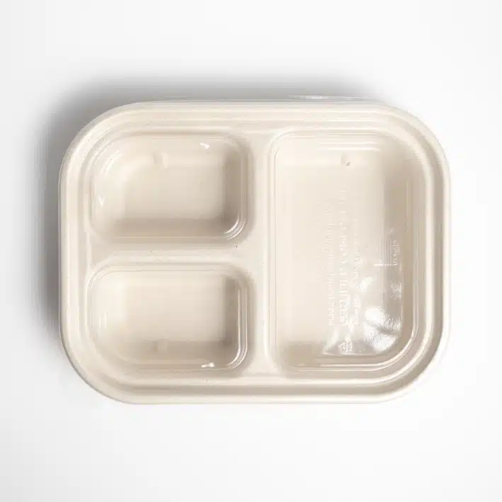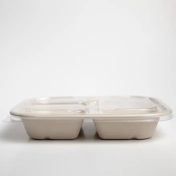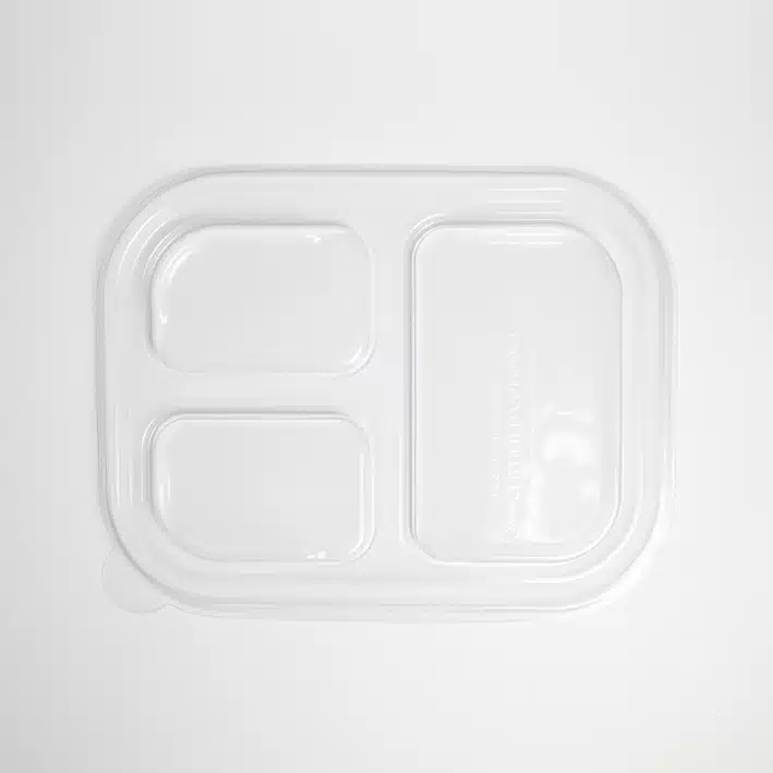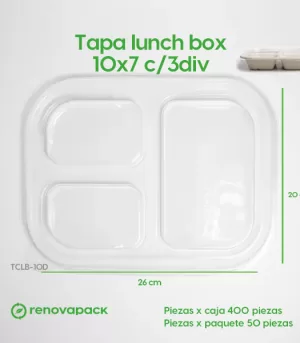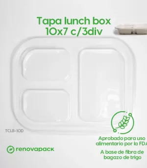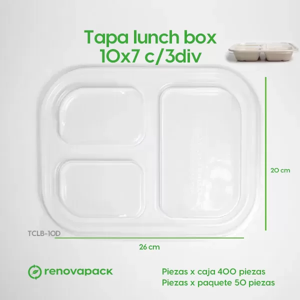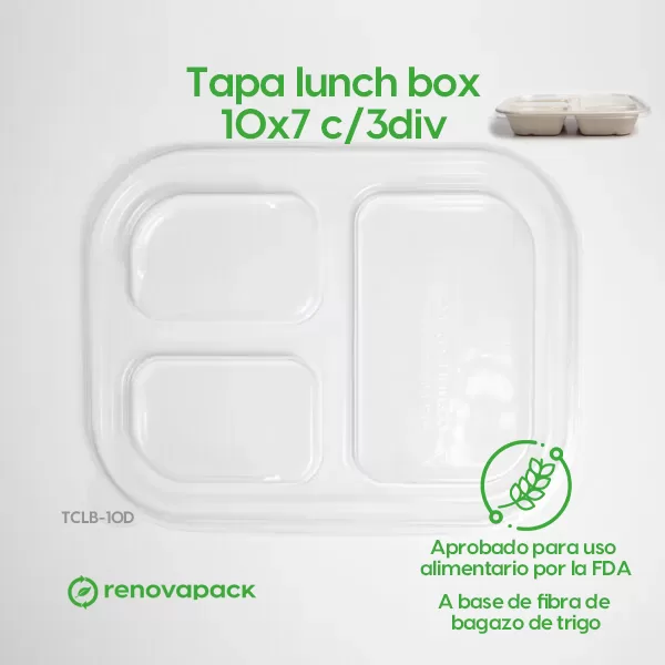 Tapa Transparente Lunch-box 10×7 c/3div Biodegradable. Hecho a base de polímero PLA. Material biodegradable y compostable. Especial para alimentos y bebidas frías. Soporta hasta 40ºC. Su degradación se da entre los 90 y los 180 días en composta industrial.