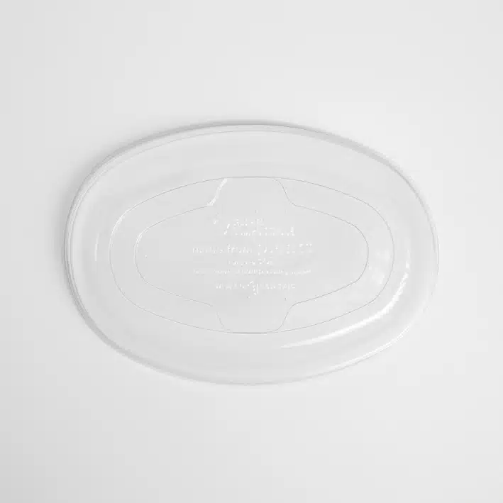 Tapa Contenedor Ovalado 18 oz. Hecho a base de polímero PLA. Material biodegradable y compostable. Especial para alimentos y bebidas frías. Soporta hasta 40ºC. Su degradación se da entre los 90 y los 180 días en composta industrial.