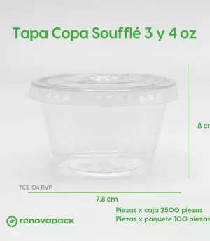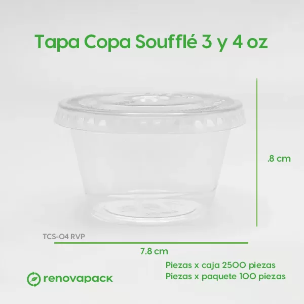 Tapa Biodegradable para copa soufflé de 3 oz o 4 oz. (7.5cm de diámetro y 0.7cm de altura) hecho de PLA, polímero constituido por moléculas de ácido láctico, es un termoplástico que se obtiene a partir de almidón de maíz.