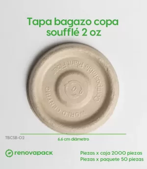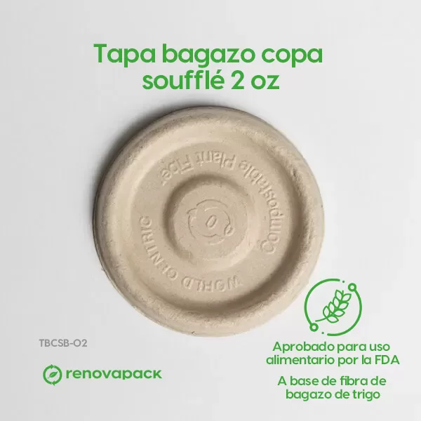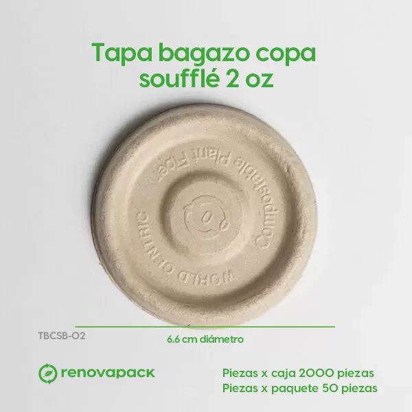 Tapa Copa Soufflé 2oz Biodegradable. Hecho a base de bagazo de trigo. Material biodegradable y compostable. Soporta microondas y congelador. No escurre ni absorbe. Su degradación se da entre los 90 y los 180 días en composta industrial.