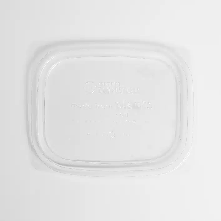 Tapa Deli Rectangular 8/12/16oz (12cm largo, 5cm ancho y 0.7cm altura). Hecho a base de polímero PLA. Material biodegradable y compostable. Especial para alimentos y bebidas frías. Soporta hasta 40ºC. Su degradación se da entre los 90 y los 180 días en composta industrial.