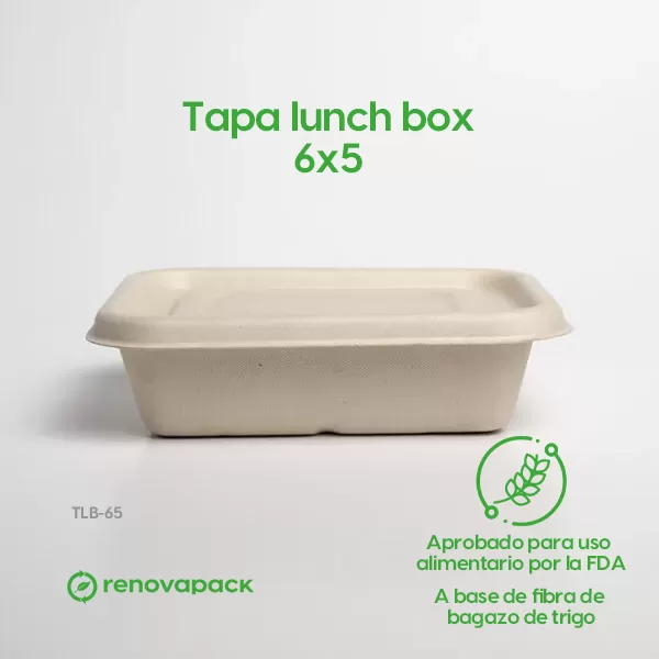 Tapa Lunch-box 6×5. Hecho a base de bagazo de trigo. Material biodegradable y compostable. Soporta microondas y congelador. No escurre ni absorbe. Su degradación se da entre los 90 y los 180 días en composta industrial.