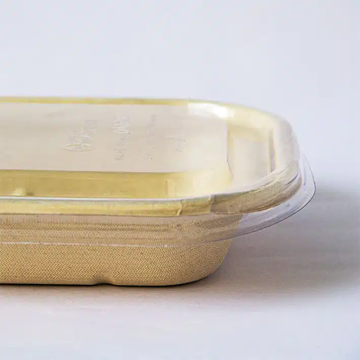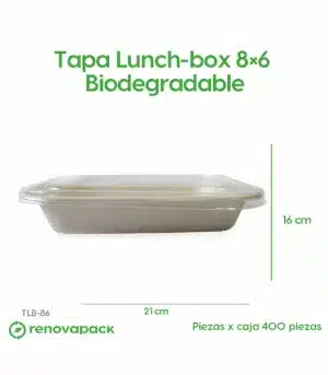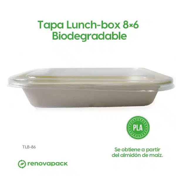 Tapa Lunch-box 8×6 Biodegradable. Hecho a base de polímero PLA. Material biodegradable y compostable. Especial para alimentos y bebidas frías. Soporta hasta 40ºC. Su degradación se da entre los 90 y los 180 días en composta industrial.