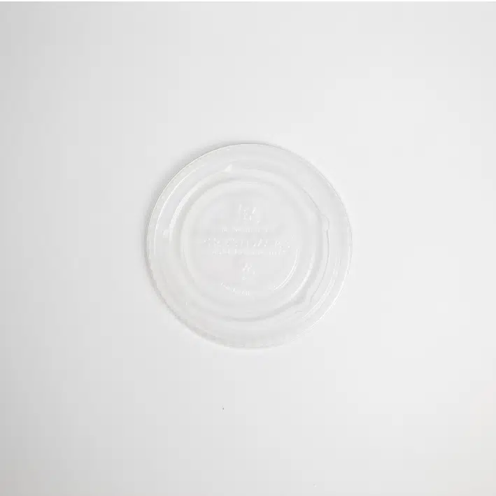 Tapa plana cerrada vasos 9/12oz. Hecho de PLA, polímero constituido por moléculas de ácido láctico, es un termoplástico que se obtiene a partir de almidón de maíz.