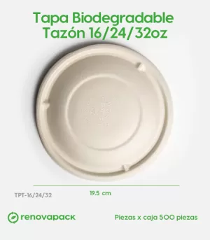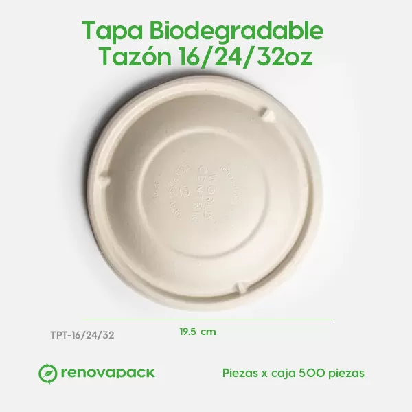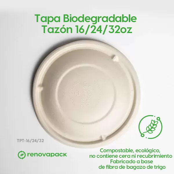 Tapa biodegradable tazón 16/24/32oz. Hecho a base de bagazo de trigo. Material biodegradable y compostable. Soporta microondas y congelador. No escurre ni absorbe. Su degradación se da entre los 90 y los 180 días en composta industrial.