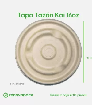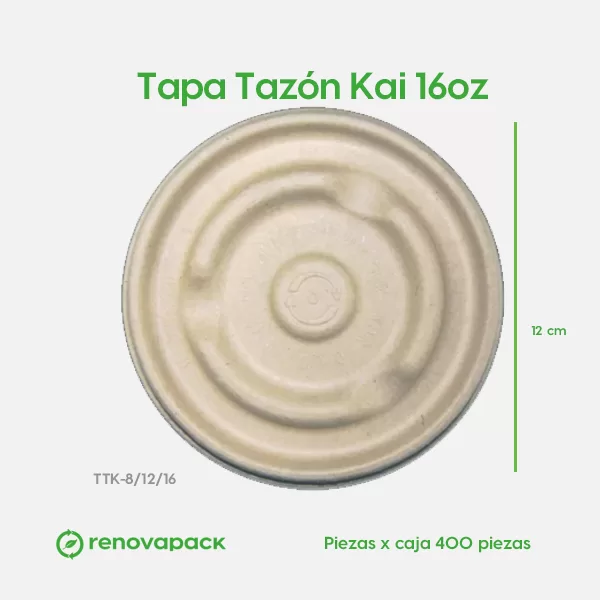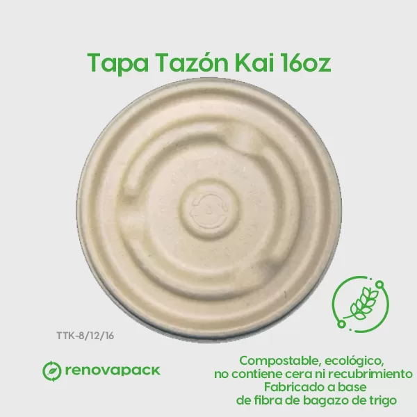 Tapa Tazón Kai 16oz. Hecho a base de bagazo de trigo. Material biodegradable y compostable. Soporta microondas y congelador. No escurre ni absorbe. Su degradación se da entre los 90 y los 180 días en composta industrial.