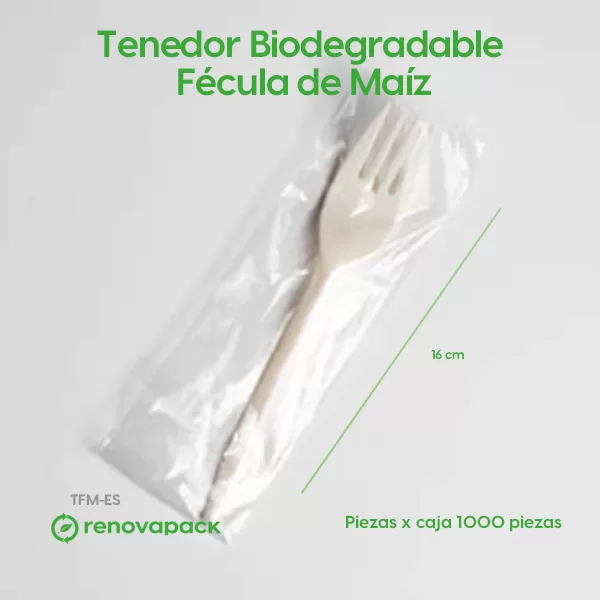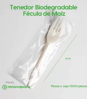Tenedor biodegradable de 6″ hecha de fécula de maíz, material 100% biodegradable. Cubiertos resistentes y flexibles, especiales para comidas frías y calientes. Tenedor estuchado en empaque de fécula de maíz compostable.