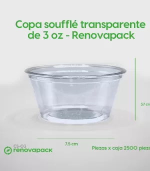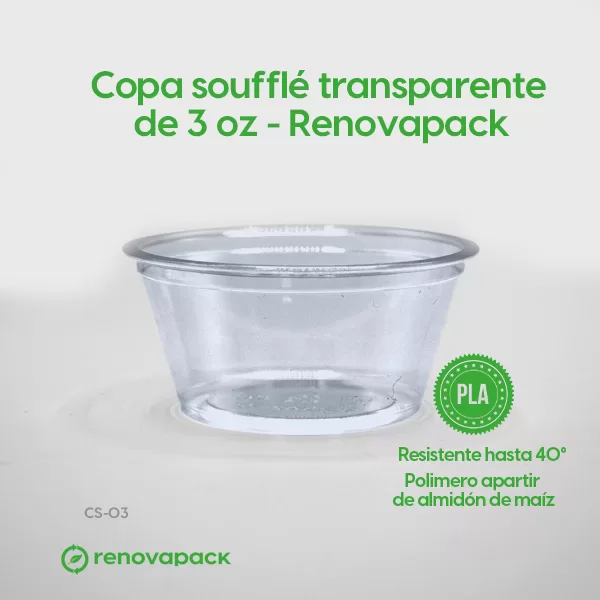 Copa soufflé biodegradable de 3 oz. La dimensión de este Remekins es de 7.5 cm diámetro x 4.5 cm de altura con una capacidad de 118.29 ml o vaso de 3 oz. Hecho de PLA un polímero de ácido láctico o termoplástico que se obtiene a partir de almidón de maíz. Este vaso soufflé resiste hasta 40 grados. Aptos para alimentos solidos y líquidos frescos, no apto para microondas.