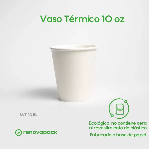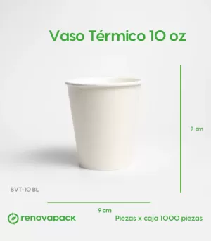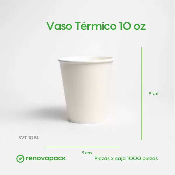 Vaso Térmico 10oz Biodegradable (9cm de diámetro, 9cm de altura, 295.74 ml de capacidad). Hecho de papel y laminado de PLA. Materiales biodegradables y compostables. Especial para alimentos y bebidas calientes. Material térmico. Su degradación se da entre los 90 y los 180 días en composta industrial.